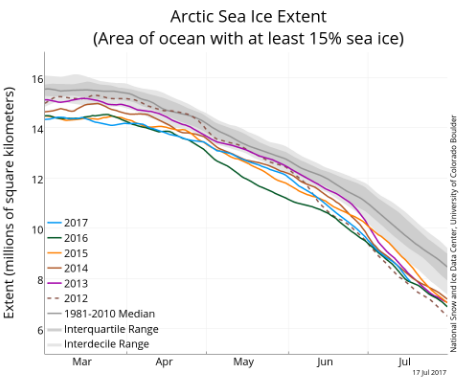 Obr.: Arktický morský ľad sa v posledných týždňoch nebadane priblížil k rekordne nízkym hodnotám pokrytia v rokoch 2012 a 2016 /http://nsidc.org/arcticseaicenews//