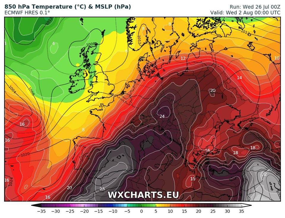Obr.:Takýto by mal byť jazyk saharského vzduchu siahajúci nad Európu z utorka na stredu (teplota v 850 hPa) /https://www.facebook.com/severeweatherEU/