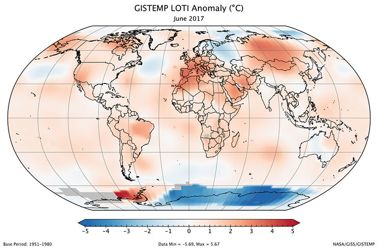Obr.: Zaznamenané odchýlky teploty vzduchu za mesiace máj (hore) a jún (dole) 2017 podľa NOAA s detailom na západnú Saharu, odkiaľ k nám prenikajú počas vĺn horúčav tropické vzduchové hmoty /https://climate.nasa.gov/news/2607/june-2017-was-fourth-warmest-june-on-record/; https://climate.nasa.gov/news/2600/may-2017-was-second-warmest-may-on-record//