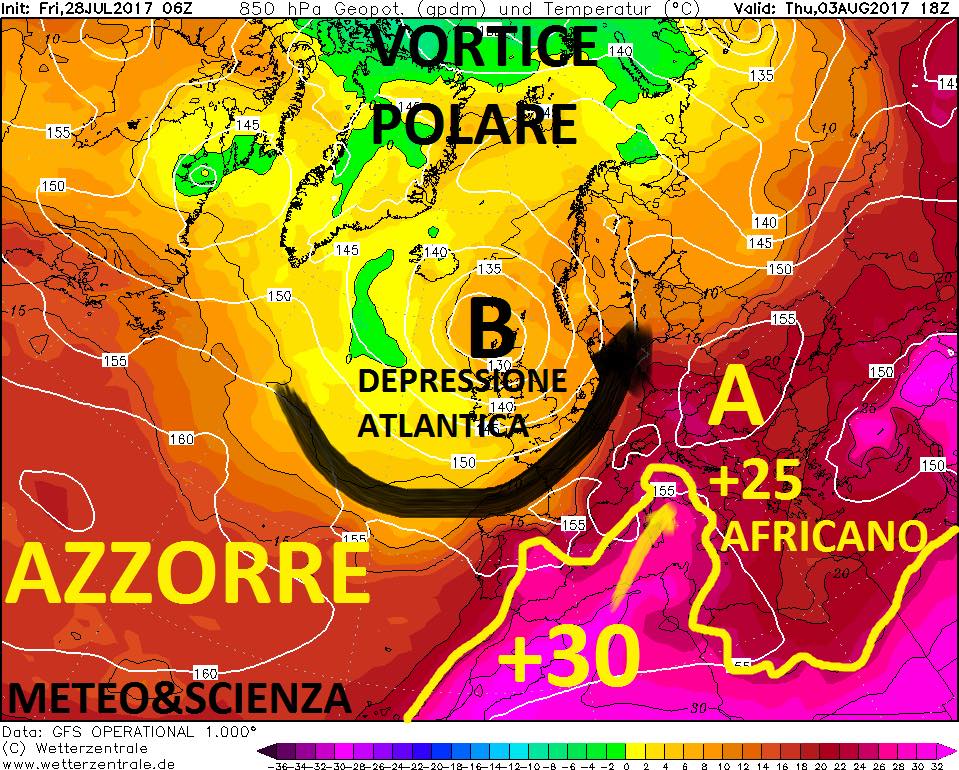 Obr.: Popis blokujúcej situácie nad strednou Európou a prílevu saharského vzduchu od J-JZ do našej oblasti a Stredomoria v nasledujúcom týždni podľa talianskych meteorológov /https://www.facebook.com/meteoscienza/