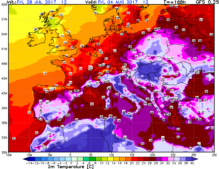 Obr.: Očakávané maximálne teploty v línii sever-juhozápad-Maďarsko podľa výstupov GFS z piatka 28. júla 2017 06Z /http://old.wetterzentrale.de/topkarten/fsgfs025meur.html/
