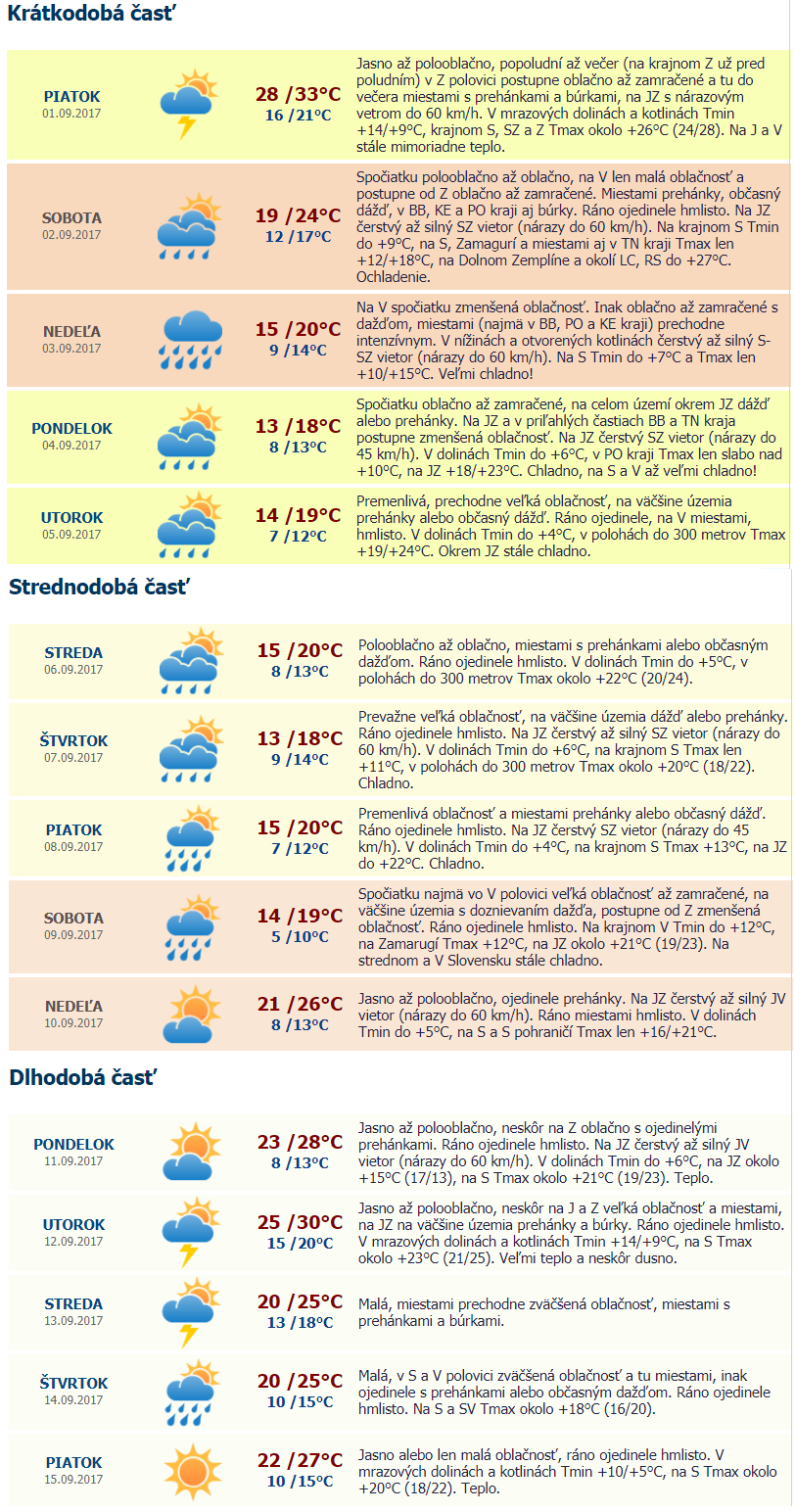 Ešte vo štvrtok 31. augusta teploty v nížinách vystúpili do +34°C a v piatok 1. septembra do +33°C. Na rade je výrazné, približne 8-dňové ochladenie, ktoré nás potrápi dažďom a nízkymi dennými teplotami (prízemné mrazy sa kvôli vyššej vlhkosti vzduchu zatiaľ neočakávajú). Výrazné ochladenie pocítime už zo soboty na nedeľu kedy k nám dorazí od SZ chladný a vlhký vzduch - v nedeľu bude pri nízkych teplotách pršať. Chladné počasie pretrvá aj prvý pracovný týždeň školského roka, preto treba deti ale aj seba vybaviť teplým oblečením, aby sme nepodcenili blížiace sa riziko prechladnutia. Letné počasie sa nakoniec podľa všetkého vráti medzi 10.-15. septembrom a možno vydrží až do 20.9.. Tretia dekáda septembra sa zatiaľ veľmi predbežne javí s ďalším ochladením a zrážkami.