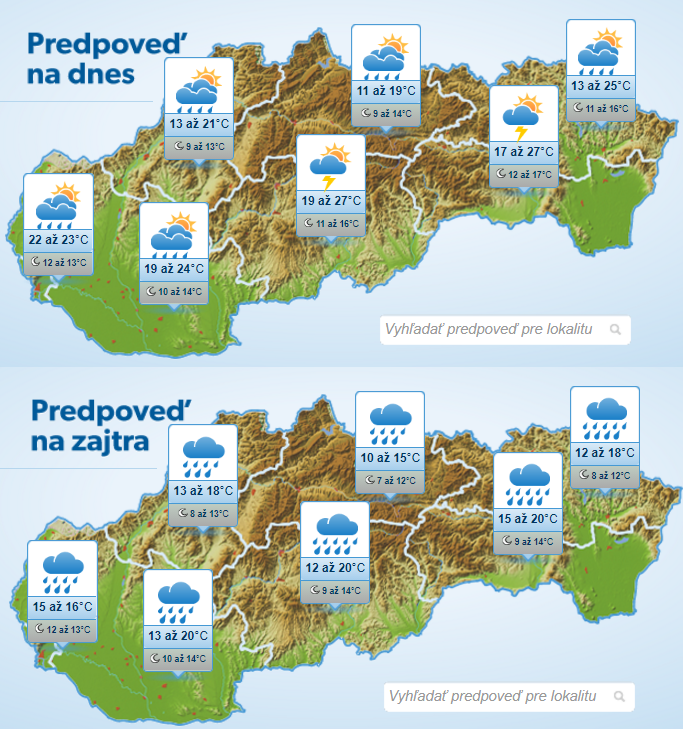 Obr.: Regionálna predpoveď na víkend počíta od severozápadu s výrazným ochladením /http://meteoinfo.sk/predpoved-slovensko-dnes; http://meteoinfo.sk/predpoved-slovensko-zajtra/