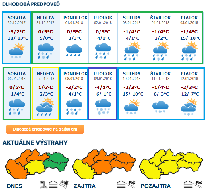 Na Silvestra sa od západu oteplí, no zmena prinesie nežiadúce komplikácie. Nielen zmena sneženia na dážď, ale aj mrznúci dážď bude najmä 31.12. ráno spôsobovať miestami poľadovicu a naďalej platia naše výstrahy 2. stupňa /http://meteoinfo.sk/vystrahy?id=581/, ktoré ocenia najmä tí, ktorí sa vyberú na prelome rokov na chaty alebo akcie mimo domova. Počasie na Silvestra bude nepriaznivé, no večer, tesne pred oslavami, zrážky ustanú a mrholiť bude už len na východnom Slovensku. Navyše, nebudeme ani drkotať zubami, pretože za teplým frontom k nám počas silvestrovskej noci prenikne teplý vzduch a len v mrazových dolinách a kotlinách klesnú teploty slabo pod nulu.