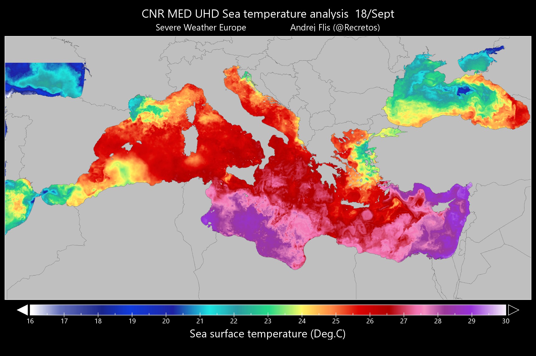 Stredozemné more je ešte výrazne teplejšie ako je priemer v polovici septembra. Rovnako je na tom aj Čierne more, ktoré je tiež oveľa teplejšie ako je priemer.
