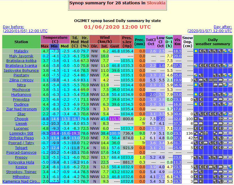 Obr. 2: Minimá teploty vzduchu dosiahnuté na vybraných staniciach počas noci na 06. 01. 2020; zdroj: ogimet.com