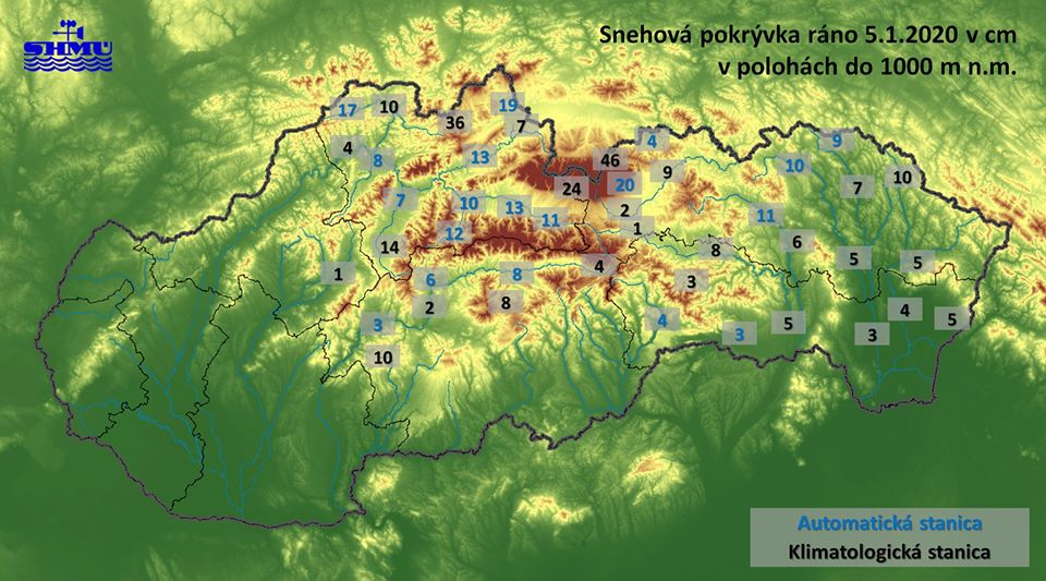 Slovenský hydrometeorologický ústav (SHMÚ) na svojom FB profile (dňa 05. 01. 2020) vyšiel so stavom snehovej pokrývky k nedeľnému (05. 01. 2020) ránu. Príslušné dáta citujeme ako obrázok 4 a návštevníkom portálu MeteoInfo.sk recipročne odporúčame pravidelnú návštevu i zmienenej platformy (FB profil SHMÚ).