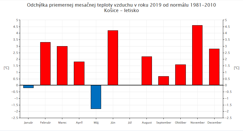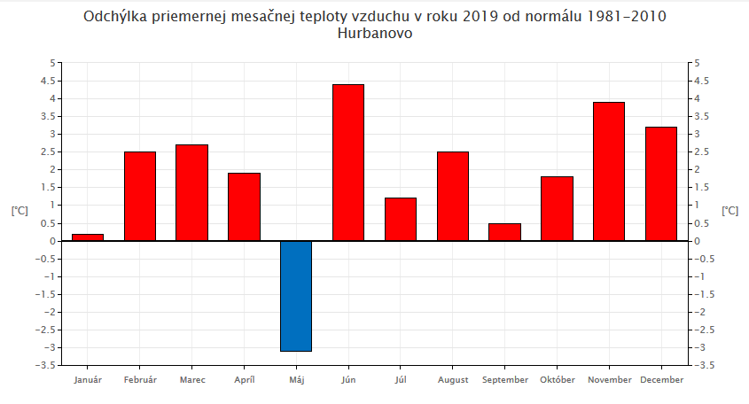 - V rámci roka 2019 len jediný mesiac skončil ako teplotne podnormálny na väčšine územia - bol ním mesiac máj. Obrázkom 5 ilustrujeme odchýlku priemernej mesačnej teploty vzduchu od normálu 1981 - 2010 v platnosti pre stanicu Hurbanovo a obrázkom 6 v platnosti pre stanicu Košice - letisko (zdrojom je klimatologické spravodajstvo dostupné na webovom sídle SHMÚ).
