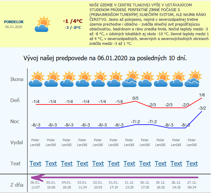 Obrázok 1 poskytuje predstavu o dennom vývoji našej predpovede počasia v platnosti pre "Troch kráľov" (06. 01. 2020) za ostatných desať dní - od 27. 12. 2019 (čítaj sprava doľava).