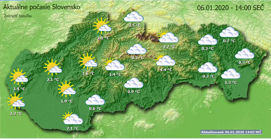 - s obrázkom 3, ktorý dokumentuje aktuálny stav (pondelok, 06. 01. 2020, 14:00 SEČ) teploty vzduchu na vybraných staniciach.