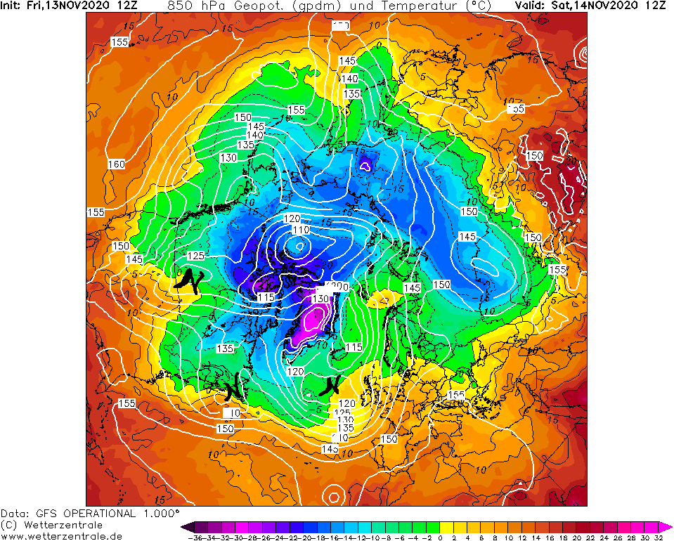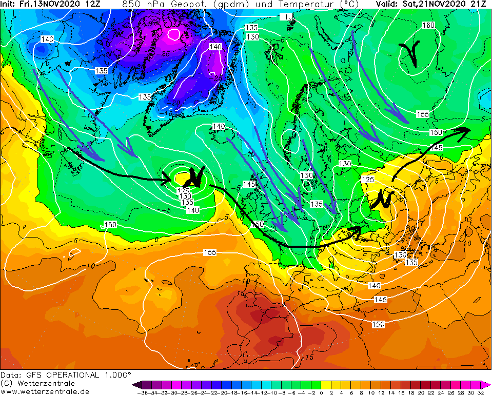 Obrázok 4 je pohľadom na európsky veľkopriestor k termínu sobota (14. 11. 2020), 13:00 SEČ optikou výškových teplotných pomerov v hladine 850 hPa (cca 1500 m n. m). Čierne orientované krivky reprezentujú storm track (polárny jet stream).
