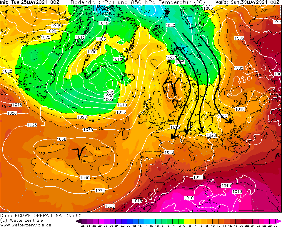 Obr. 1: Prízemné tlakové pole a výškové teplotné pomery (v hladine cca 1500 m n. m.) k termínu nedeľa (30. 05. 2021), 01.00 SELČ - numerický model ECMWF (iniciované 25. 05. 2021, 01.00 SELČ); zdroj: wetterzentrale.de
