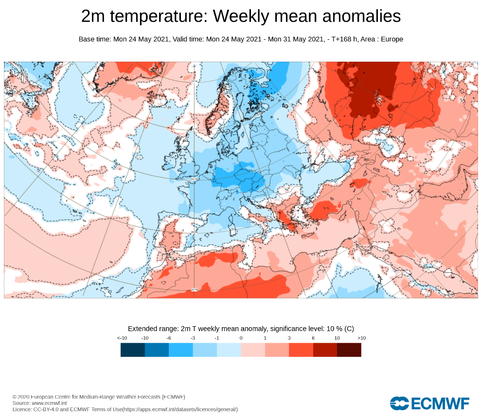 Obr. 2: Výpočet očakávaných odchýlok teplotných pomerov (vo výške 2 m) voči dlhodobému priemeru v platnosti pre týždeň 24. 05. 2021 (pondelok) až 31. 05. 2021 (pondelok) - numerický model ECMWF (iniciované 24. 05. 2021); zdroj: apps.ecmwf.int