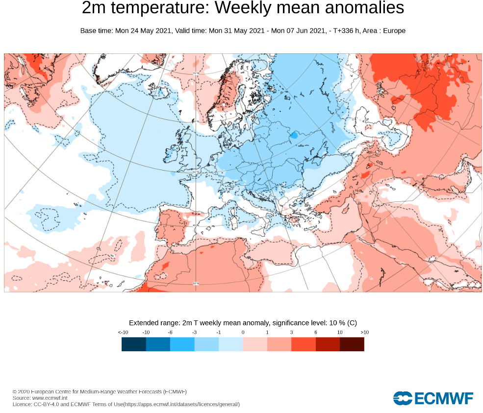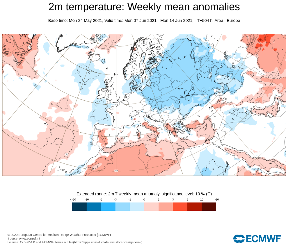 Obr. 3: Výpočet očakávaných odchýlok teplotných pomerov (vo výške 2 m) voči dlhodobému priemeru v platnosti pre týždeň 31. 05. 2021 (pondelok) až 07. 06. 2021 (pondelok) - numerický model ECMWF (iniciované 24. 05. 2021); zdroj: apps.ecmwf.int
