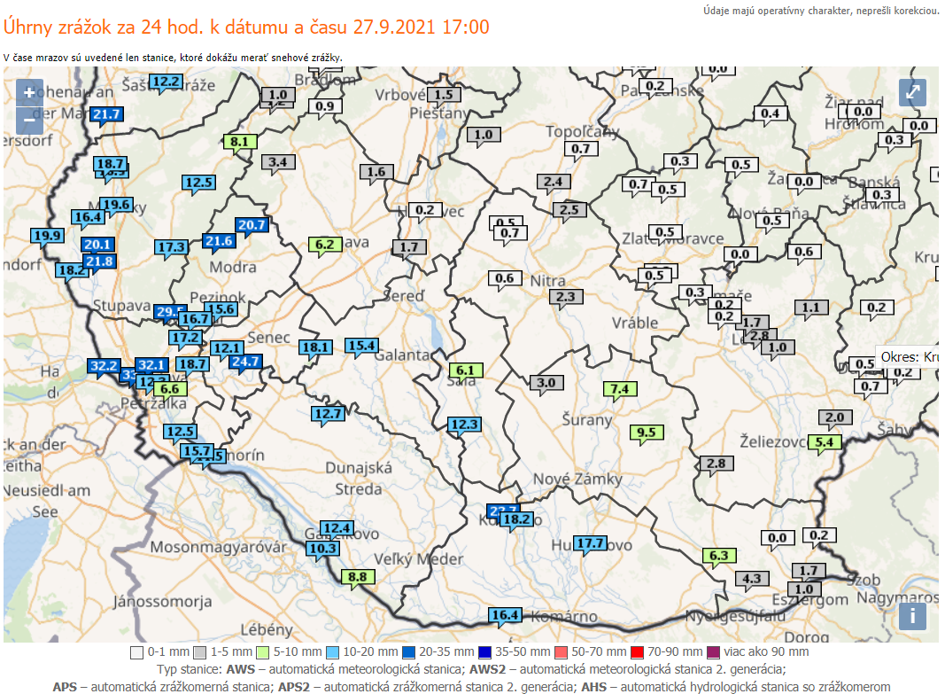 Obr. 1: 24-hodinové zrážkové úhrny v mm k termínu pondelok, 27. 09. 2021, 17.00 SELČ; zdroj: shmu.sk
