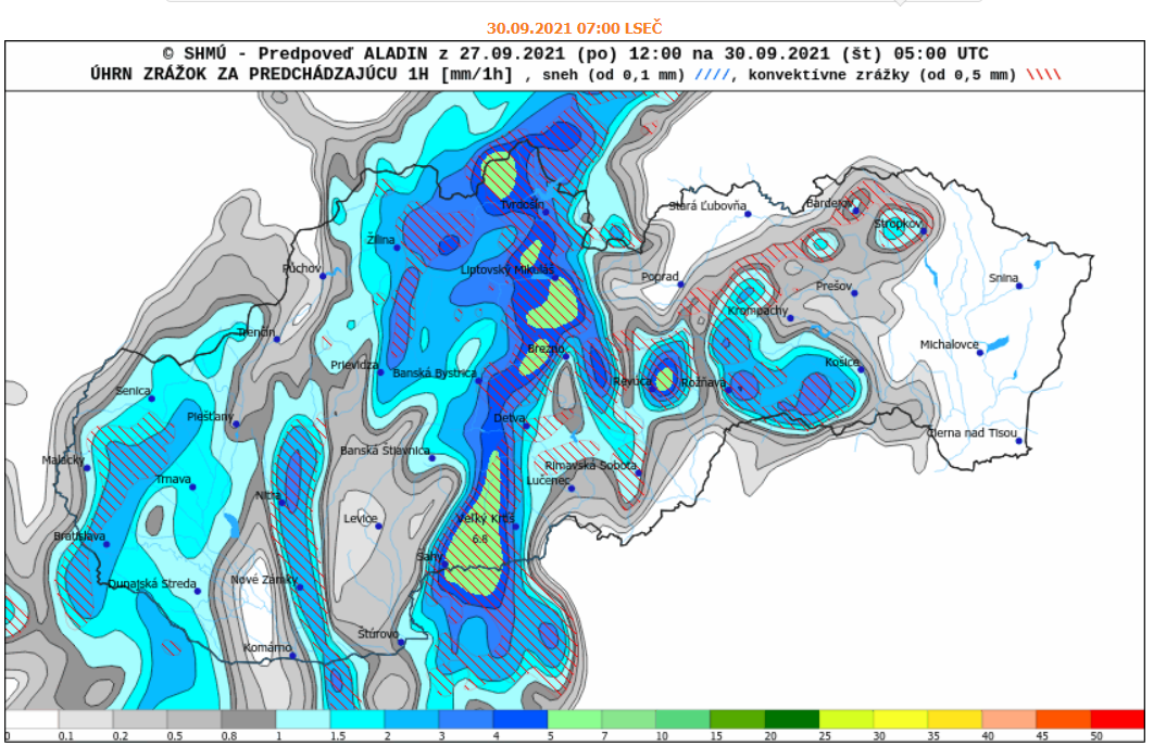 Obr. 2: Očakávaný 1-hodinový zrážkový úhrn v mm k termínu štvrtok, 30. 09. 2021, 07.00 SELČ - numerický model ALADIN (iniciované 27. 09. 2021, 14.00 SELČ); zdroj: shmu.sk