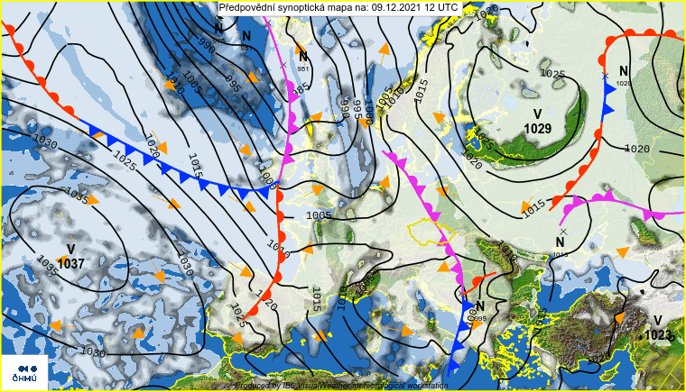Obr. 1: Poveternostná situácia k termínu štvrtok, 09. 12. 2021, 13.00 SEČ; zdroj: chmi.cz