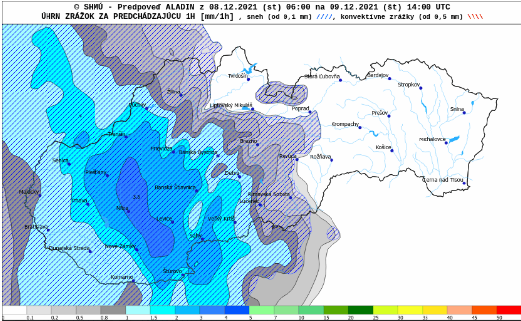 Obr. 2: Zrážkové realizácie (1-hodinový úhrn v mm) k termínu štvrtok (09. 12. 2021), 15.00 SEČ - numerický model ALADIN (iniciované 08. 12. 2021, 07.00 SEČ); zdroj: shmu.sk