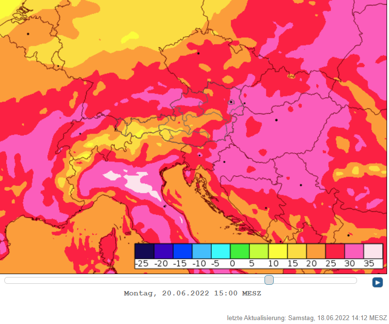 Obr. 1: Teplotné pomery k termínu pondelok (20. 06. 2022), 15.00 SELČ - numerický model ALARO (iniciované 18. 06. 2022, 14.12 SELČ); zdroj: zamg.ac.at