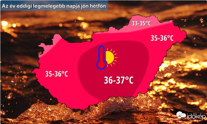 Obr. 2: Očakávané maximá teploty vzduchu v Maďarsku v platnosti pre pondelok (20. 06. 2022); zdroj: idokep.hu