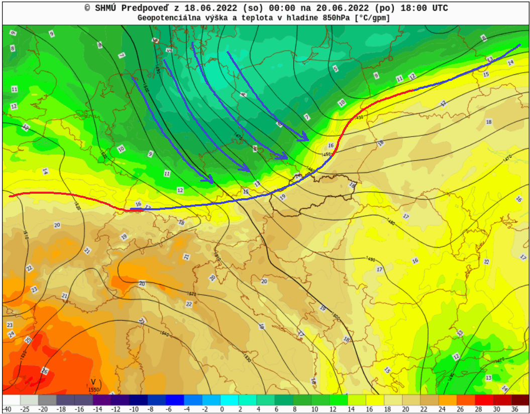 Budeme písať pondelkový (20. 06. 2022) podvečer, kedy do tohto vyhriateho prostredia sa začne vkliňovať kontrastný studený front. Na obrázku 3 (terminovanom k pondelku, 20. 06. 2022, 20.00 SELČ) môžeme vidieť, že pred čiarou tohto frontu nás bude umárať horúca vzduchová hmota, ktorá v referenčnej hladine cirka 1500 m n. m. bude dosahovať teplotu až 19 °C, kdežto za čiarou frontu pôjdu teploty v tejto hladine (cirka 1500 m n. m.) pod 5 °C.