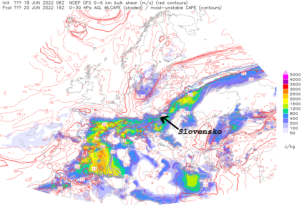 Obrázok 4 - terminovaný k pondelku (20. 06. 2022), 20.00 SELČ - je dôrazným indikátorom skutočnosti, že ovzdušie, ako sme vyššie naznačili, bude značne "strihnuté". A to vytvára dobrý predpoklad pre potenciálnu organizáciu búrok do ucelených formácií (napríklad do ohnutej linky náchylnej na ťažké nárazy vetra) alebo pre potenciálny vznik rotujúcich izolovaných búrkových jadier (máme na mysli supercely).