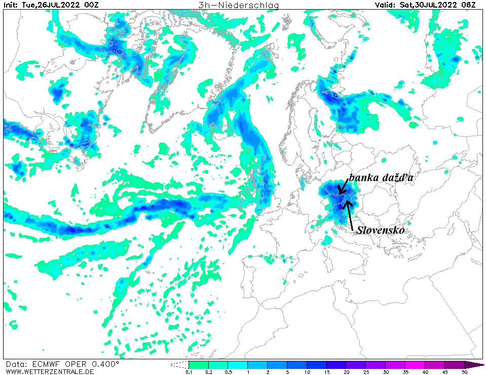 Na základe výstupov numerických modelov sa ukazuje, že do našej oblasti vnikne banka dažďa spojená s cyklónou. Táto banka dažďa je dobre vyjadrená na obrázku 1 - ide o trojhodinový zrážkový úhrn k termínu sobota (30. 07. 2022), 08.00 SELČ z pera modelu ECMWF.