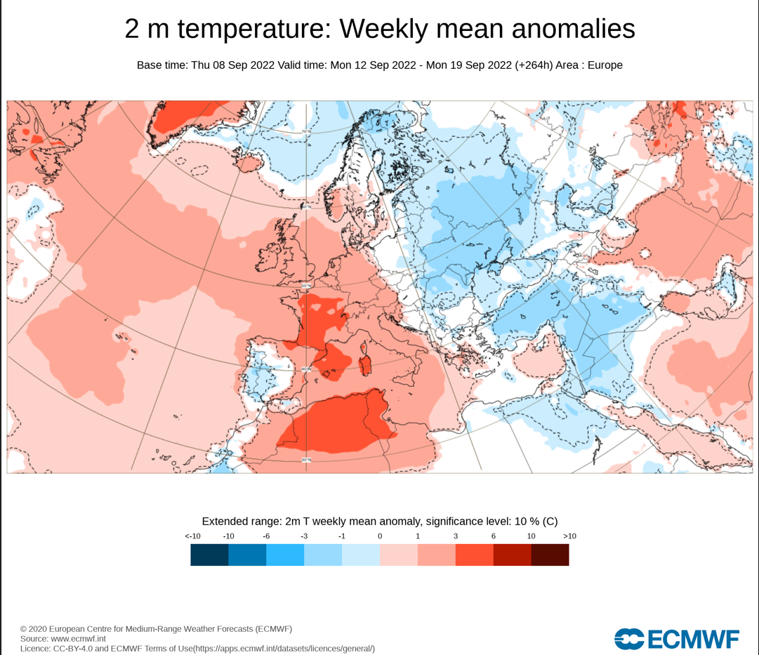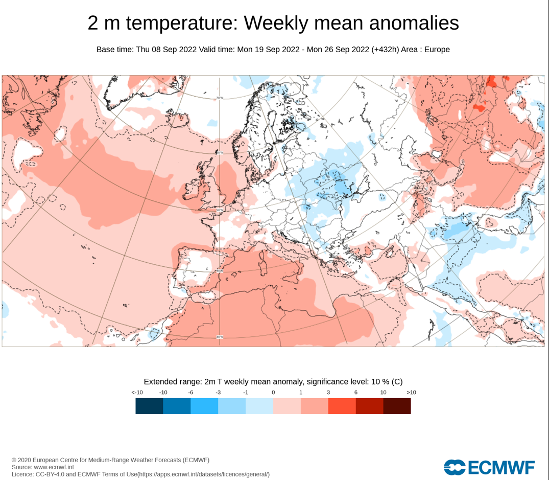 Obr. 2: Očakávaná odchýlka teplotných pomerov pri zemi (2 m) pre týždeň 12. 09. 2022 až 19. 09. 2022; zdroj: ecmwf.int