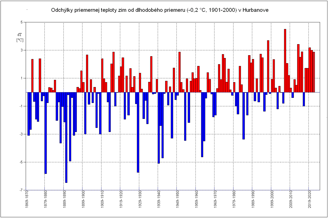 Keď si všimneme obrázok 4 (odchýlky teplotného priemeru jednotlivých zím v Hurbanove voči dlhodobému priemeru 1901 - 2000), tak musíme vysloviť ešte jednu obavu - a to v platnosti pre zimu 2022/2023. Totiž, máme za sebou päť po sebe idúcich teplých zím. A, chtiac-nechtiac, musíme skonštatovať, že napriek tomu, že vo všeobecnosti sú naše zimy teplejšie a teplejšie, predsa len - ako o tom svedčí obrázok 4 - po skupine teplých zím udrie zima, ktorá je štipľavá.