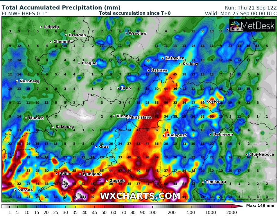 Mnohých z nás zaujíma, kde spadne najviac zrážok. Obrázok 3 je výstupom modelu ECMWF a prezentuje očakávaný zrážkový kumulatív (v mm) k noci na pondelok (25. 09. 2023). Na obrázku 3 je vidno regióny, ktoré by podľa modelu ECMWF mali byť dažďom postihnuté najväčšmi. Ihneď však musíme dodať, že rozvlnené studené fronty nie sú zvlášť dobre predikovateľné s ohľadom na zrážkové ťažisko. Inými slovami - obrázok 3 je potrebné poňať s istou mierou tolerancie, pokiaľ ide o lokalizáciu najväčšieho objemu dažďa. Tak či onak však platí, že očakávané dažde budú regionálne dobre výdatné (pripomíname, že 1 milimeter zrážok činí 1 liter vody na každý štvorcový meter). A sú výpočty, ktoré sú ešte agresívnejšie než model ECMWF v obrázku 3.
