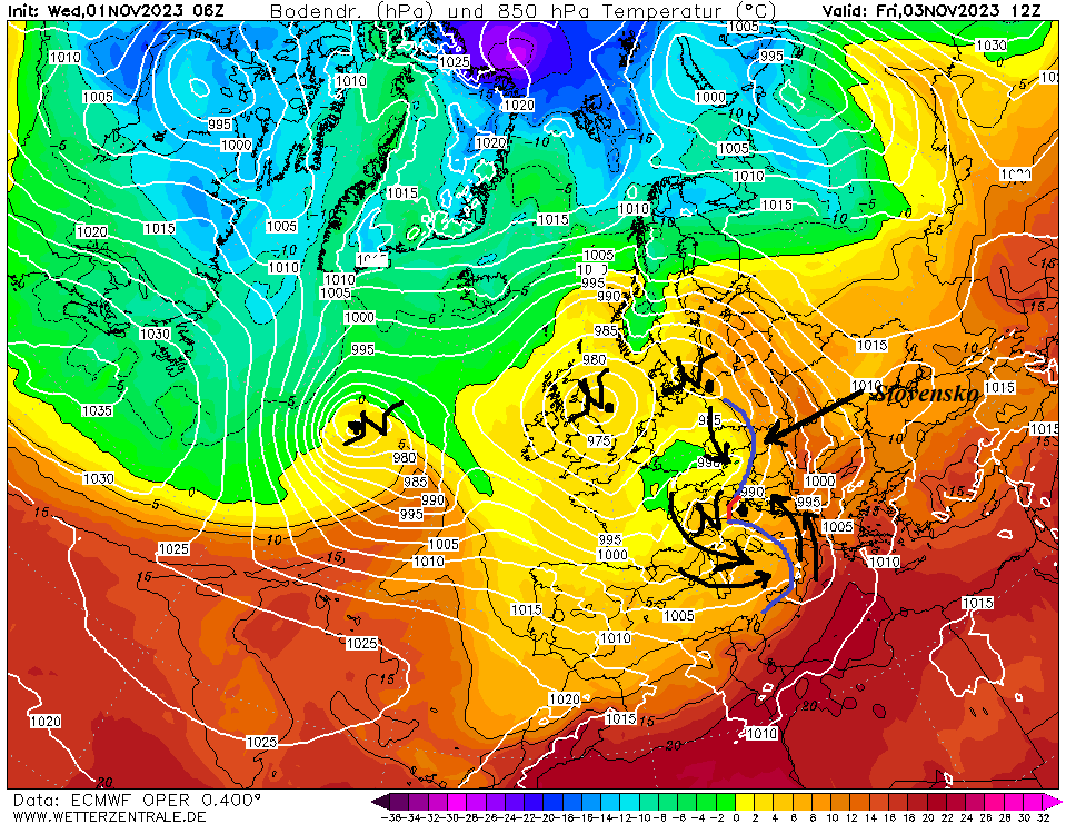 Obr. 1: Prízemné tlakové pole a výškové teplotné pomery v hladine cca 1500 m n. m. k termínu piatok (03. 11. 2023), 13.00 SEČ - numerický model ECMWF (iniciované 01. 11. 2023, 07.00 SELČ); zdroj: wetterzentrale.de