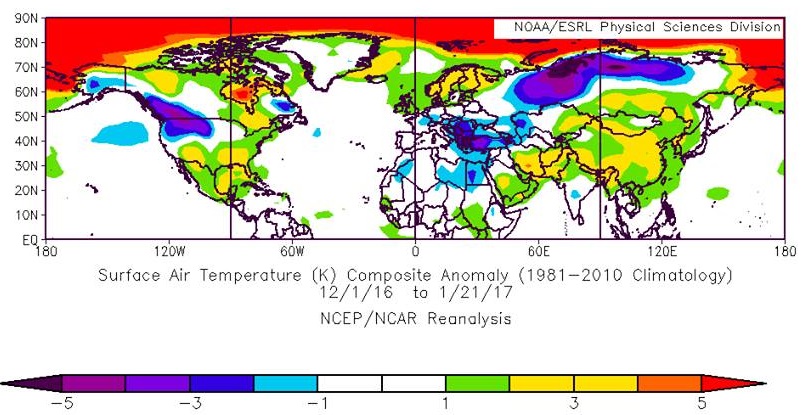 Klimatológovia SHMÚ už na FB stránke informovali, že január 2017 predbežne skončí ako najchladnejší január za posledných 30 rokov, teda od roku 1987. Teplotné odchýlky od platného DP budú dosahovať okolo -4°C (-2/-6°C), mesiac tak môžeme kategorizovať prevažne ako veľmi chladný. Mrazy počas januára vrcholili vo 2 vlnách a tretia nás ešte len čaká do konca tohto týždňa. Ešte pred tým, ako prišiel prvý - najvýraznejší vrchol zimy (8.1. Oravská Lesná -35,2°C, Zázrivá -33,3°C, Dudince -30,1°C), teploty aj na prelome rokov klesali niekoľko dní pod -18°C. Studený vzduch počas prvej polovice januára zalial celú Európu a z hôr a vyššie položených regiónov začal postupne stekať do najnižších polôh - aj preto druhý vrchol mrazov nebol zaznamenaný v dolinách, alebo na severe, ale neďaleko Rimavskej Soboty, v Skerešove, kde namerali v piatok 20. januára -24,2°C. Teploty pod -20°C klesali počas vrcholenia tejto druhej vlny mrazov aj v najteplejších častiach Východoslovenskej nížiny. Grónska výš, ktorá tieto mrazy priniesla sa postupne presunula nad východnú Európu, no krátkodobé predpovede očakávajú, že táto blokujúca výš sa od štvrtka do nedele vráti z Ruska, Ukrajiny a Bieloruska naspäť nad Karpaty a Balkán, a preto opäť zosilnejú mrazy. Studený vzduch, ktorý sa k nám po týždni vráti bude veľmi suchý - toto tretie januárové vrcholenie mrazov by malo okolo piatka 27. januára priniesť teploty v Banskobystrickom alebo Košickom kraji do -22°C, možno až -24°C. Celý zvyšok januára vlastne bude, ako sme už avizovali v predchádzajúcich článkoch mrazivý, okrem chladných rán spôsobí inverzia aj dni s celodennými mrazmi. Situácia sa začne meniť už na prelome mesiacov.