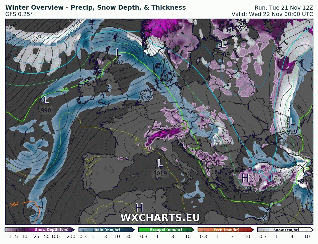 Arktický vzduch, ktorý mal priniesť silné mrazy po súčasnom ochladení aj na Slovensko nakoniec úraduje v Škandinávii a Pobaltí - Švédsko v utorok ráno hlásilo mrazivých -30,3°C, kým Slovenskom postupovala na východ frontálna vlna s veľkými zásobami vlhkosti. Kým Oravská Lesná hlási okolo 30 cm snehu a sneženie sa objavilo na väčšine územia ZA, PO, KE, BB a TN kraja, na juhozápade pršalo a najhustejšie obývaná oblasť Slovenska tak na prvé sneženie stále ešte len čaká. Po tom, ako prejdu 4 sychravé a teplé dni (do Kataríny, 25.11.) v nedeľu dorazí studený front, za ktorým možno predbežne čakať v budúcom týždni zlepšenie zimných podmienok na horách a v polohách nad 300 metrov. Či sa sneženie objaví aj na juhozápade, ešte uvidíme.