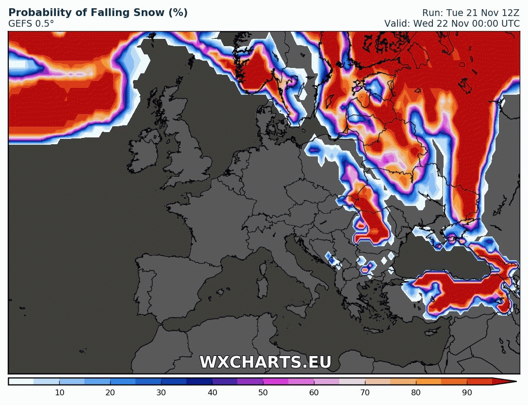 Animácie: Odhora nadol: očakávaný tlak a zrážky, odchýlky teploty v 850 hPa od DP, "zimný prehľad" a pravdepodobnosť sneženia /http://wxcharts.eu/