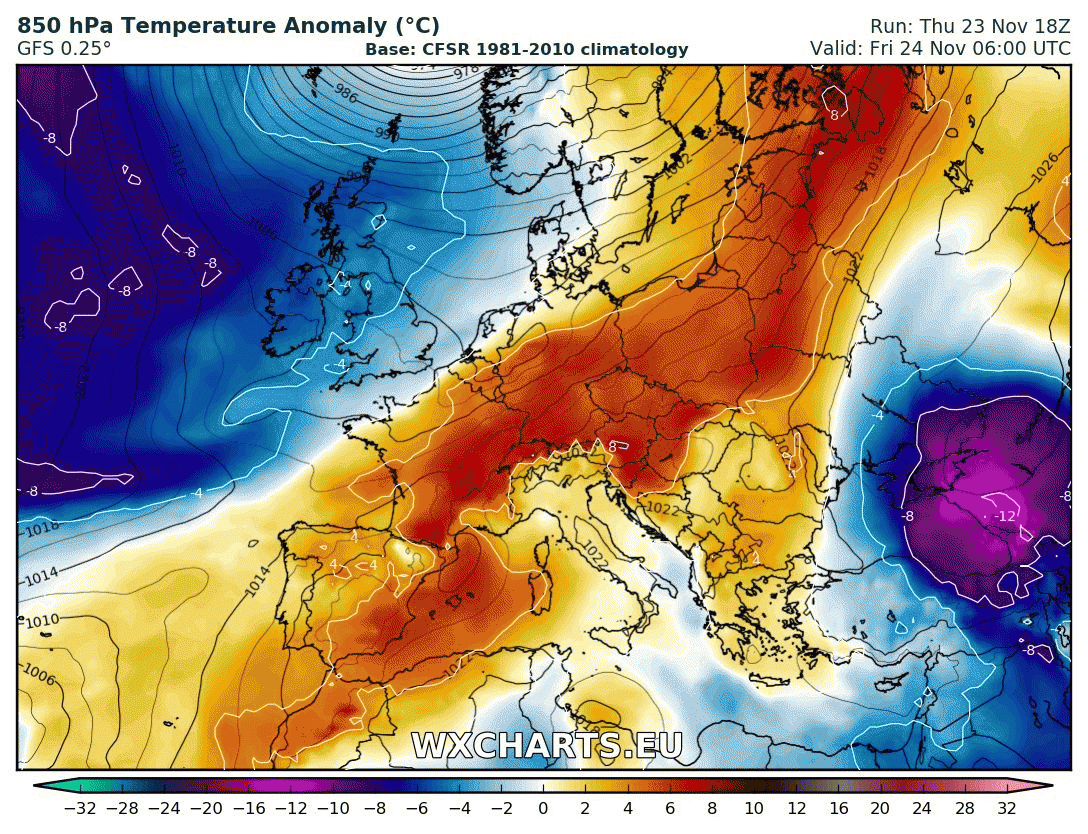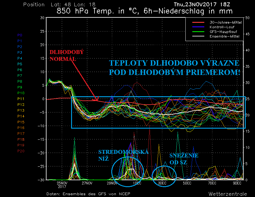 Po uplynulých 2 novembrových ochladeniach, ktoré vrcholili 15. novembra mrazmi do -9,1°C /SHMÚ/ a 21. novembra snežením v severnej a východnej polovici Slovenska došlo od stredy do soboty nečakane ku krátkodobému otepleniu. Aj keď skôr sme avizovali katarínske oteplenie a Katarínu na blate, niekoľko dní sa zdalo, že nás zasiahne vlna chladu, ktorá nakoniec udrela severne od nás (Švédsko -30,3°C). 4-dňové oteplenie prináša hmly a nízku oblačnosť, no v stredu sa podarilo na JZ otepliť až do +16°C. Kým v piatok ešte očakávame početné hmly a len na JZ pri regionálne zmenšenej oblačnosti do +12°C (inak len +3/+8°C), v sobotu sa pred výrazným studeným frontom, po prechode ktorého očakávame výrazné dlhotrvajúce ochladenie, rozfúka silný J-JV vietor, na JZ tak bude opäť šanca na teploty do +16°C, pri hmle bude len +4/+9°C. Kto bol z naších predpovedí sklamaný, že zima neprišla, však nemusí zúfať, pretože po 4-dňovej prestávke to konečne vyzerá na dlhotrvajúcu vlnu chladu - aj so snežením a zosilnením mrazov. Očakávané dlhotrvajúce ochladenie sa už potvrdzuje tretí deň za sebou, čo pridáva predpovediam váhu, navyše sa zdá, že aj predpovedné modely sa stabilizovali a veľká väčšina behov má tendenciu sledovať trendy ansámblových a kontrolných výstupov.