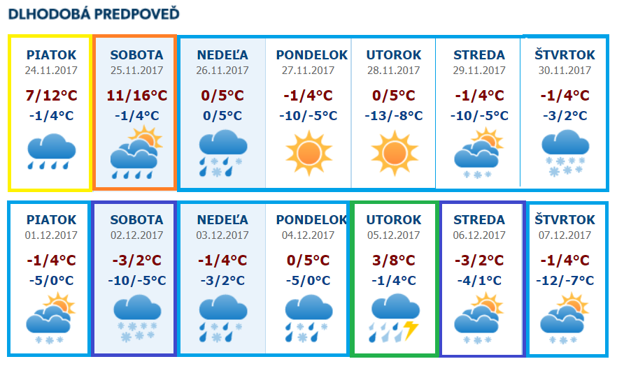 Kým v sobotu pred frontom môže byť vietor naozaj nepríjemný - na juhozápade až búrlivý s nárazmi do 90 km/h a v Tatrách a Nízkych Tatrách až mohutná víchrica (do 150 km/h), v nedeľu sa vietor zmení na severozápadý, stále bude silný, no oproti sobote mierne zoslabne, no už nebude teplý ale chladný. Na severe bude už v nedeľu celý deň snežiť, inak hranica sneženia klesne od rána (300 metrov na SZ - 900 metrov na JV) do večera na 200 metrov. Po prechode frontu očakávame od pondelka do stredy niekoľko mrazivých rán - v pondelok a v stredu v dolinách do -10°C, v utorok až do -13°C, na juhozápade bude v pondelok a stredu 0/-5°C, v utorok -2/-7°C. Na severe už v pondelok začne v pondelok séria dní s celodennými mrazmi. V stredu sa postupne od SZ začne prepadať ponad strednú Európu nad Stredomorie rozsiahla cyklonálna oblasť, ktorá vyprodukuje jadranskú níž. Vo štvrtok bol GFS veľmi prajný, čo sa týka sneženia spojeného s touto nížou - aj na juhozápade by totiž podľa neho malo okolo 30.11. (štvrtka) nasnežiť 3-12 cm snehu, v Banskobystrickom a Trenčianskom kraji (náveterné oblasti) až 10-30 cm a snehová pokrývka 2-10 cm by sa ušla aj zvyšným regiónom Slovenska. Potom by sa len nakrátko vyjasnilo so zosilnením mrazov a už 2. decembra by prišlo ďalšie sneženie - tentokrát od severozápadu, vplyvom ďalšej prepadajúcej sa cyklóny nad vnútrozemie. Pred Mikulášom by podľa posledných výstupov malo sneženie prejsť na juhu cyklonálnej oblasti pred príchodom výrazného studeného frontu prechodne do dažďa, front môže byť dosť výrazný, dokonca s ojedinelými bleskovými výbojmi, aj silným vetrom na JZ a na horách. Po jeho prechode by sa mala zima opäť vrátiť, tentokrát s možnosťou viac dní sa sebou so zosilnením ranných mrazov.