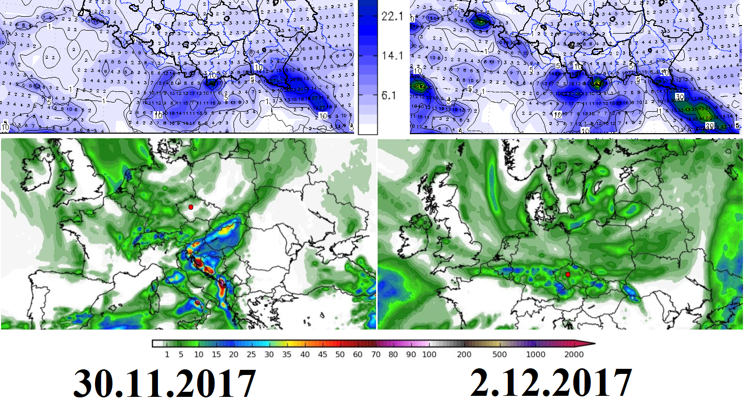 Obr.: Detail na potenciálne situácie so snežením okolo 30.11. a 2.12. 2017 - výška snehovej pokrývky a regióny s náveterným efektom zrážok /https://meteomodel.pl; http://wxcharts.eu/