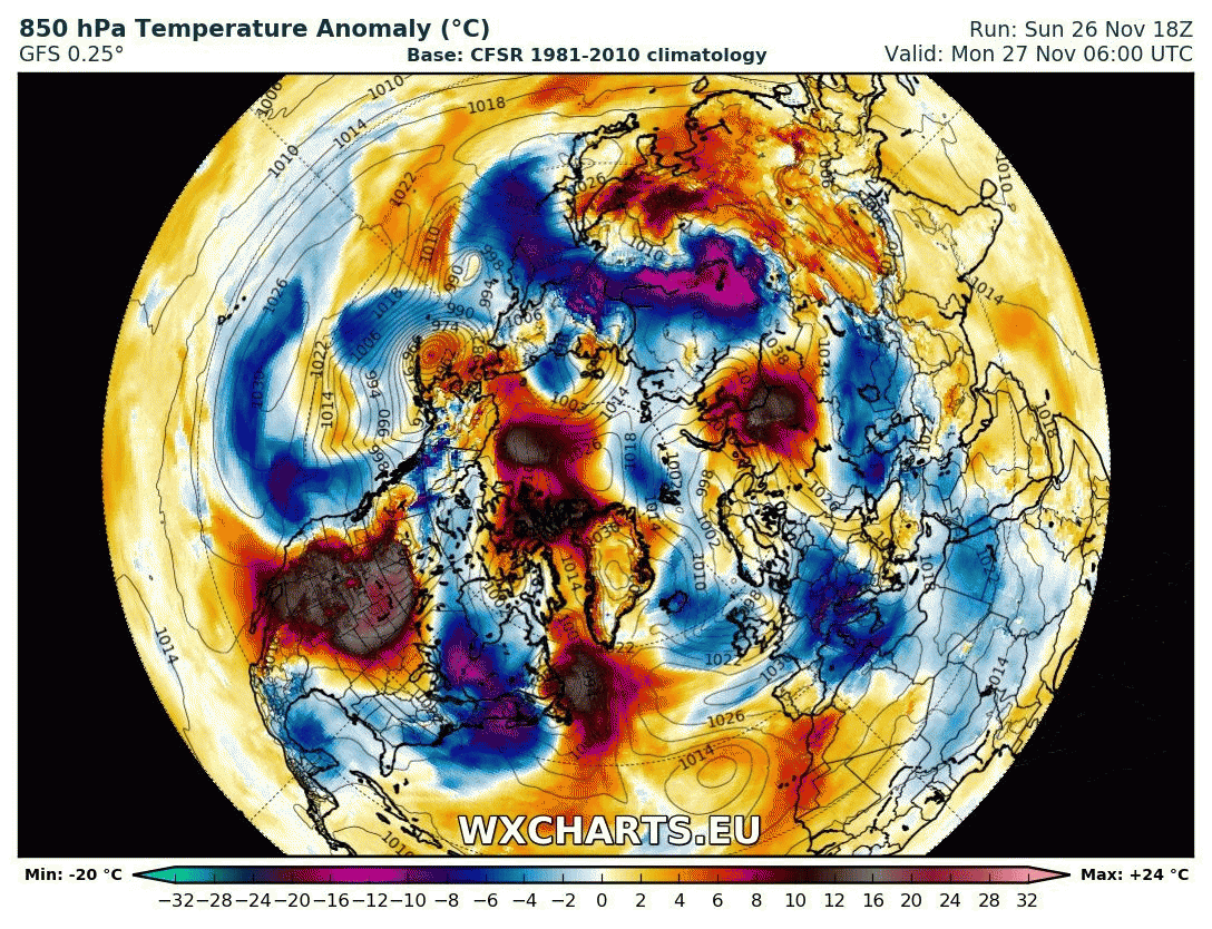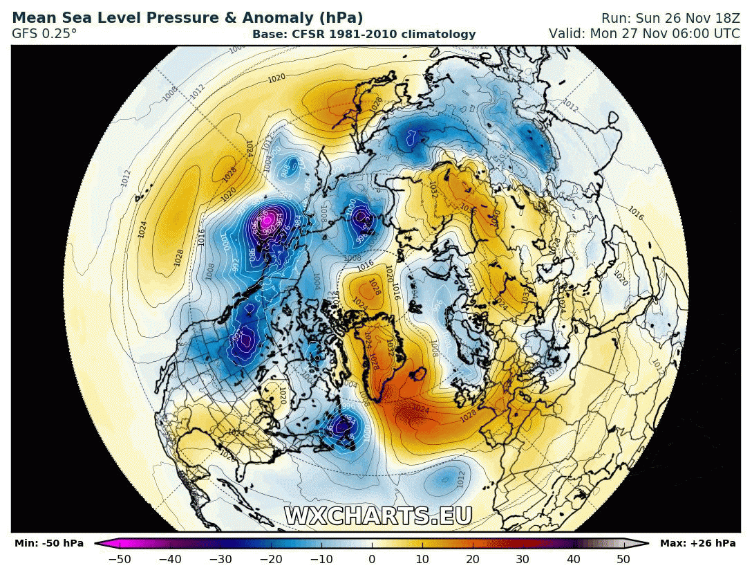 Nad Arktídou vysoký tlak a teplo, v južných šírkach rozpadnutý vortex a vlny chladu, studené počasie môže pretrvávať celý december...