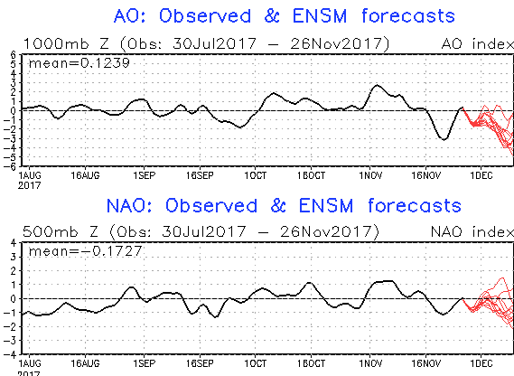 Obr.: Očakávaný (či neočakávaný?) decembrový pokles AO a NAO indexu môže priniesť veľmi chladný december 2017 /http://www.cpc.ncep.noaa.gov/products/precip/CWlink/daily_ao_index/ao.shtml; http://www.cpc.ncep.noaa.gov/products/precip/CWlink/pna/nao.sprd2.gif/
