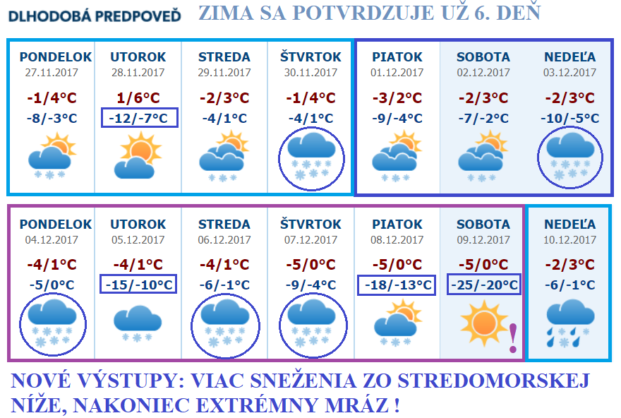 Ako sumarizujeme v uplynulom článku /http://meteoinfo.sk/clanok/52260-studene-pocasie-sa-potvrdzuje-uz-5.-den-pridu-3-etapy-mrazov-12-15-18c-a-2-vlny-snezenia - v ňom sú aj odkazy na predošlé 4 články ako dôkaz, že zima sa čaká už 6 dní/, nečakane prudký nástup zimy potvrdzujeme v predpovediach a spravodajstve už takmer týždeň a predpovede sa už v nedeľu začali vypĺňať. Nedeľu totiž môžeme považovať za začiatok dlhodobého ochladenia - na severe už počas dňa snežilo, tvorila sa snehová pokrývka a popoludňajšie teploty dosahovali záporné hodnoty. Do neskorého večera sa postupne rozsnežilo aj na východnom Slovensku. Ako sme avizovali v predošlom článku, naozaj nás čakajú až 3 zosilnenia mrazov - jedno už v utorok 28. novembra (doliny do -12°C), druhé pred Mikulášom (toto sa však zmiernilo na úkor pretrvávajúceho sneženia zo stredomorskej cyklonálnej oblasti) a nakoniec najvýraznejšie ochladenie po Mikuláši, ktoré predvčerom vyzeralo na -20°C, včera na -18°C a dnes až na extrémne nízkych -25°C v našich dolinách. Dlhotrvajúce pôsobenie stredomorskej rozsiahlej cyklonálnej oblasti (lepšie označenie ako len stredomorská níž) navyše medzi 29. novembrom a 8. decembrom podľa najnovších výstupov prinesie nečakane veľa snehu - snehová pokrývka sa vytvorí na celom území Slovenska, čo bude mať vplyv na výraznejší prepad teplôt počas neskorších jasných nocí.