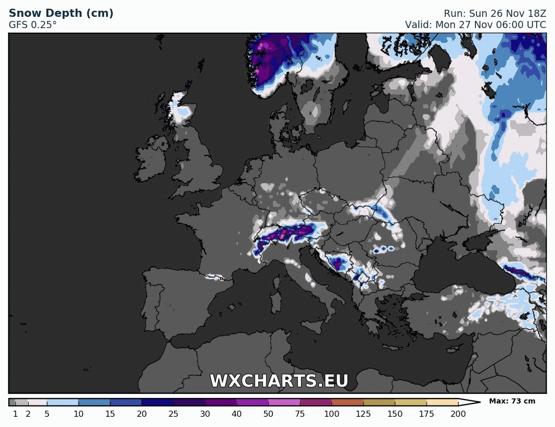 Stredomorská obrovská cyklonálna oblasť prinesie na Slovensko veľa dní so snežením (medzi 29.11.-8.12.), model vykreslil aj potenciálnu dosiahnuteľnú hranicu mrazov do -25°C, uplynulé 2 dni to vyzeralo "len" na -18/-20°C