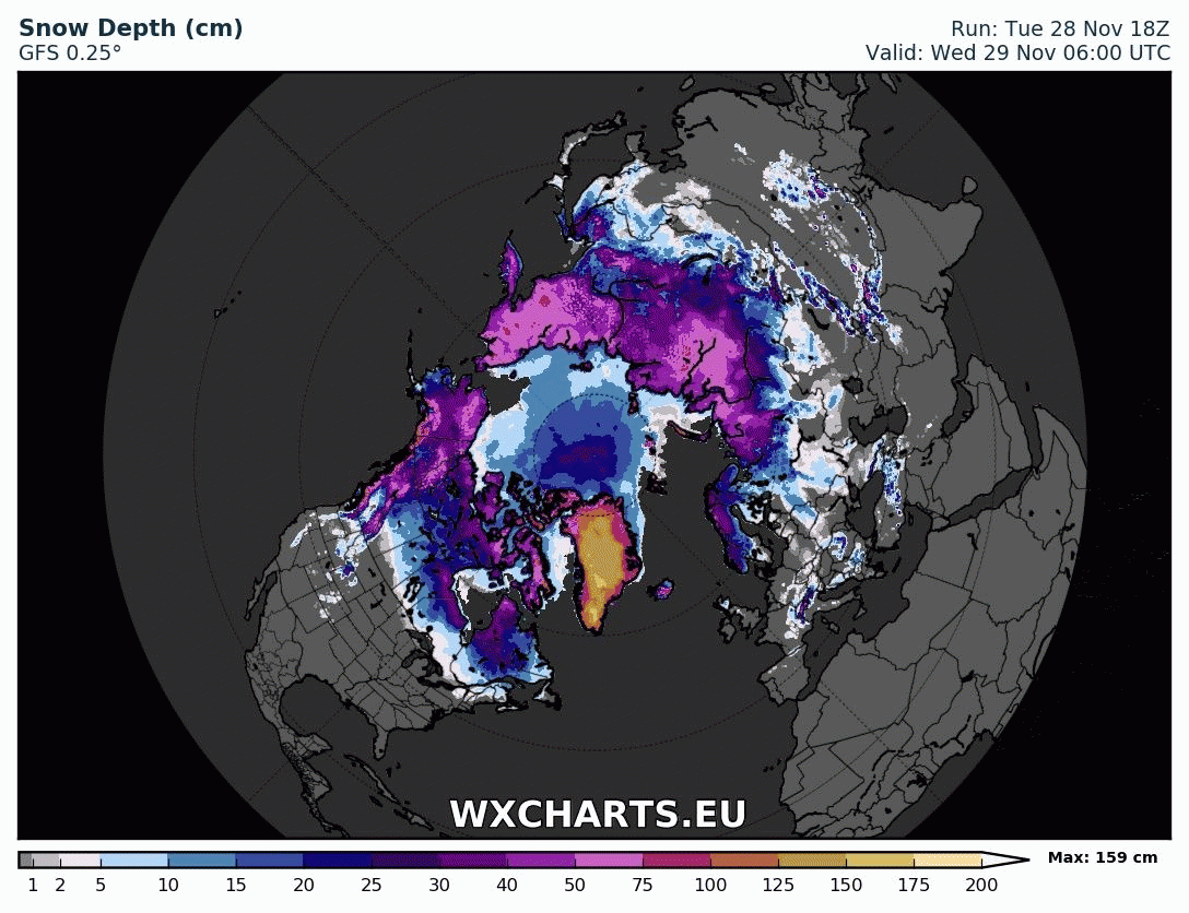 Obr.: Očakávaný vývoj snehovej pokrývky a odchýlok teploty na severnej hemisfére (všimnite si hlavne Európu) počas najbližších 16 dní /http://wxcharts.eu/