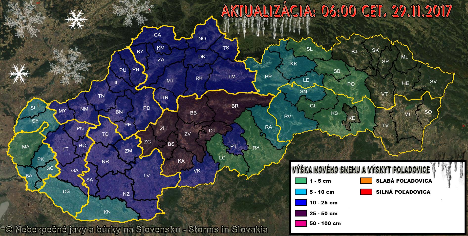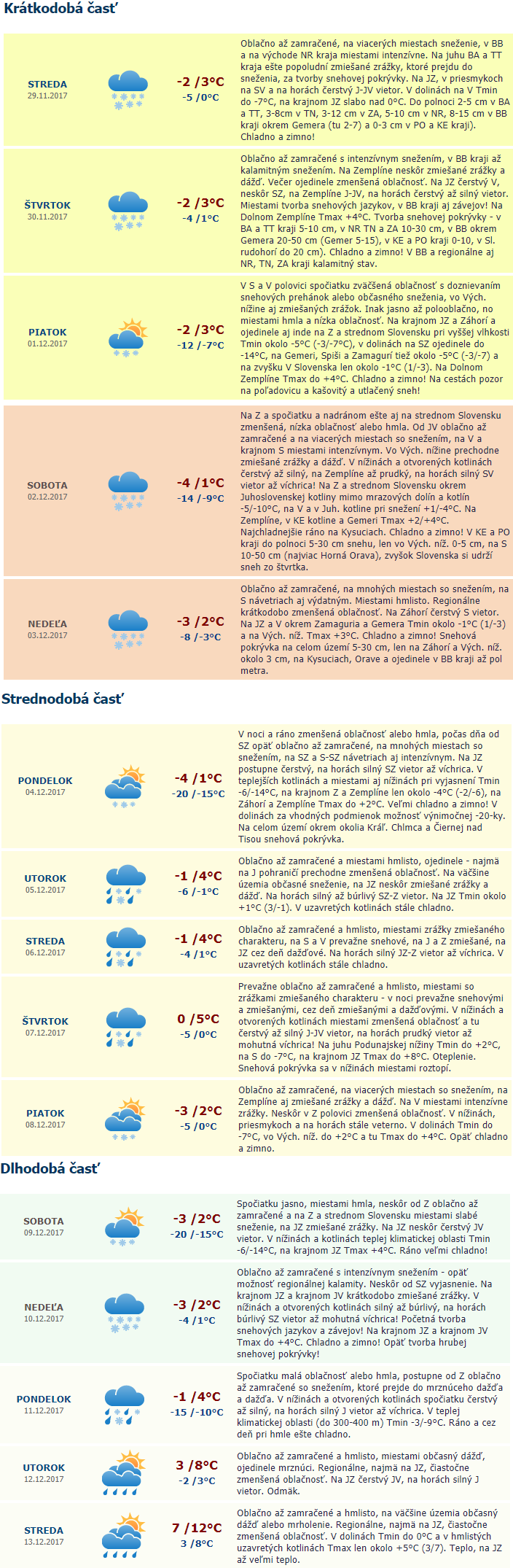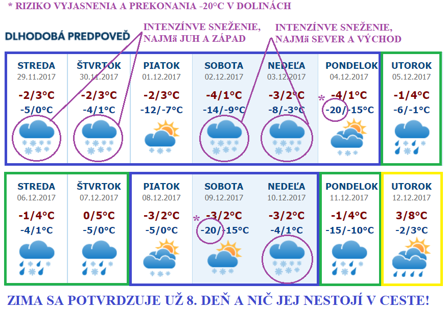 Už takmer 20 dní pretrvávajú na Slovensku chladné podmienky - prečo je tomu tak, sme načrtli na /http://meteoinfo.sk/clanok/52239-ocakavame-predcasny-prichod-zimy-vortex-zazije-silny-rozpad-ao-a-nao-klesnu-velmi-nizko/ a v sérii ďalších novembrových článkov /http://meteoinfo.sk/clanky?date=11-2017/. Kým novembrové ochladenia k nám boli ešte zhovievavé a priniesli len mrazy do -10°C a sneženie len mimo juhozápadného Slovenska, zdá sa, že v najbližších dňoch pocítime zimu vo všetkých jej prejavoch. Výrazné ochladenie čakáme v predpovediach už 8. deň za sebou /sériu článkov nájdete v odkazoch v posledných 2 aktualizáciách /http://meteoinfo.sk/clanok/52261-podla-novych-vystupov-nasnezi-10-30-cm-a-hrozia-extremne-mrazy-do-25c; http://meteoinfo.sk/clanok/52262-novembrova-kalamita-v-nr-tn-bb-za-kraji-v-stredu-stvrtok-10-30-cm-snehu-navetria-pol-metra/ a pár hodín pred úderom zimy už niet pochýb, že jeseň sa s nami rozlúči a zima nás privíta mimoriadne nadštandardne zimnými podmienkami