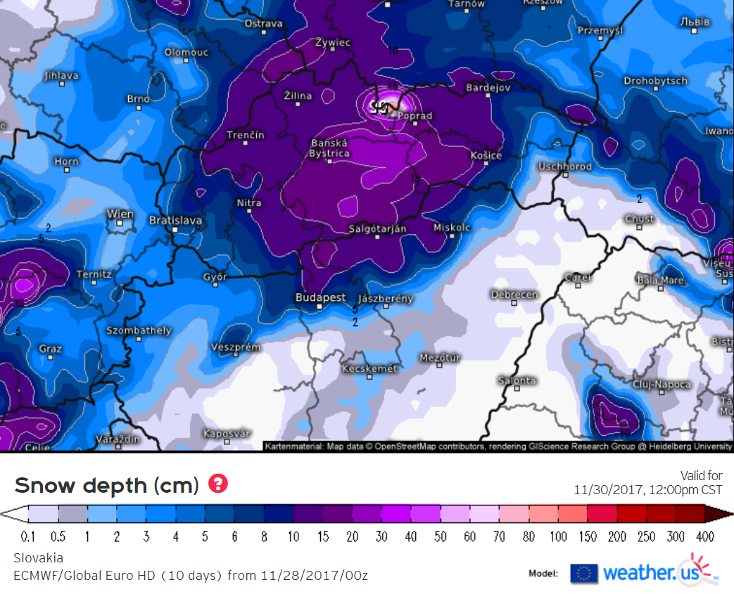 Obr. Očakávaná snehová pokrývka v najbližších dňoch podľa modelu ECWWF sa približne zhoduje s očakávanými výstupmi podľa modelu GFS - intenzívne sneženie príde vo 2 vlnách - prvej už v stredu a vo štvrtok na západnom a strednom Slovensku a druhej cez víkend, najmä na východe a severe