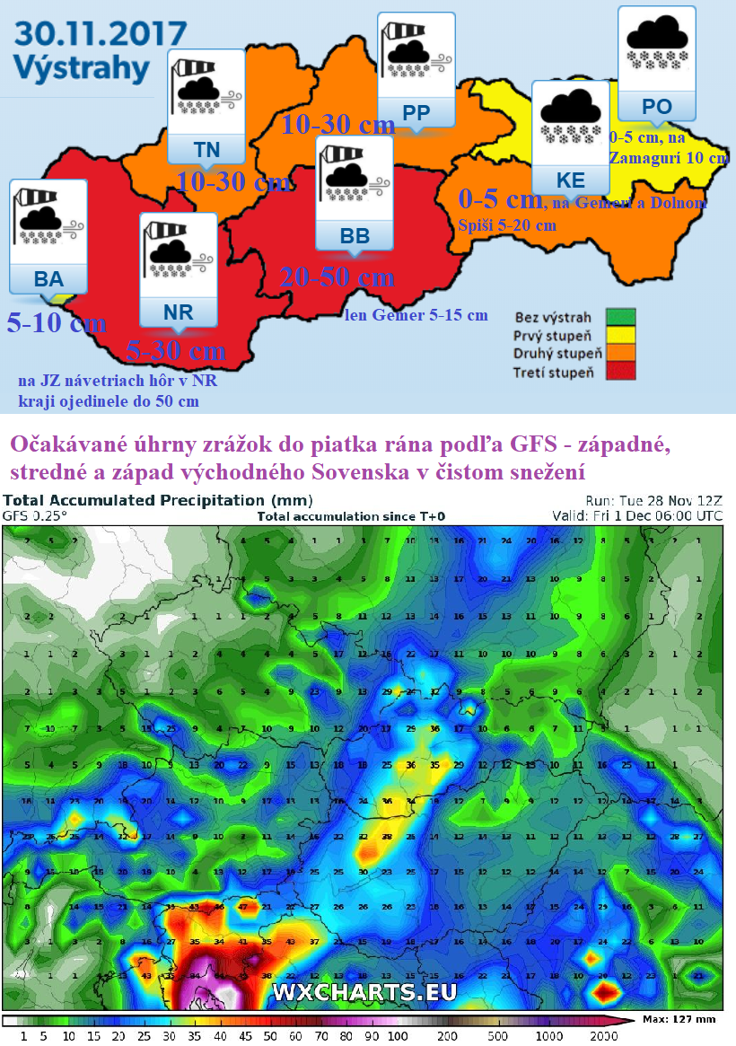 Obr.: Naše výstrahy pred intenzívnym snežením a 48-hodinové úhrny zrážok (na západnom a strednom Slovensku v čistom snehu) od stredy do piatka rána /http://meteoinfo.sk/vystrahy; http://wxcharts.eu/