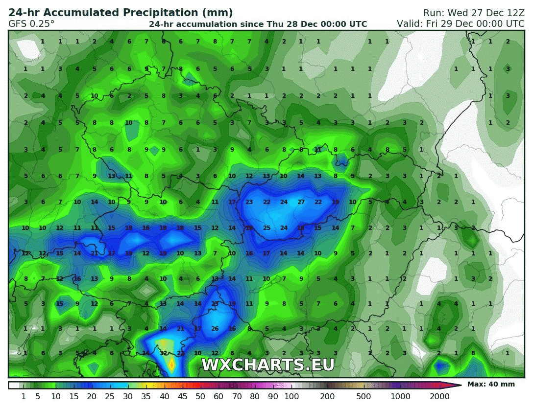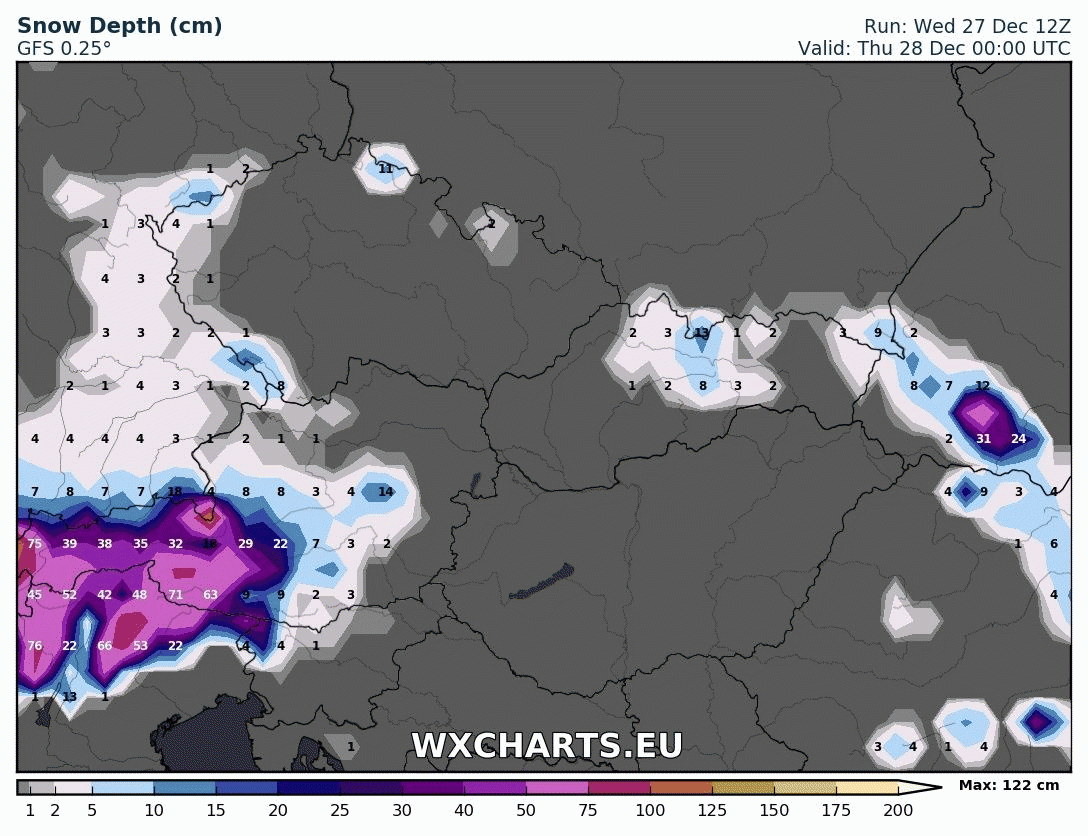 Od štvrtka do soboty 28.-30. decembra sa nakoniec dočkáme návratu zimy, no stále to nebude nič v porovnaní s očakávanými zmenami v januári, kedy sa rysuje situácia podobná minulému roku, kedy v Oravskej Lesnej namerali -35,6°C. Najbližšie ochladenie zatiaľ prinesie pokles hranice sneženia zo štvrtka na piatok do najnižších polôh, pričom GFS počíta s prechodnou tvorbou snehovej pokrývky takmer na celom území, vrátane juhozápadného Slovenska. Z piatka na sobotu sa následne vyjasní a teploty môžu klesať ešte nižšie ako sa čakalo, podľa čerstvých materiálov až na -12/-17°C v dolinách a -2/-8°C v nížinách a kotlinách teplej klimatickej oblasti. Na severe a v uzavretých kotlinách očakávame aj 3 dni so slabým celodenným mrazom do -2°C. Naopak, na juhozápade bude pomerne živo, s lepšou cirkuláciou vzduchu a teplejšie, až do +5°C, takže snehová pokrývka sa bude rýchlejšie topiť.