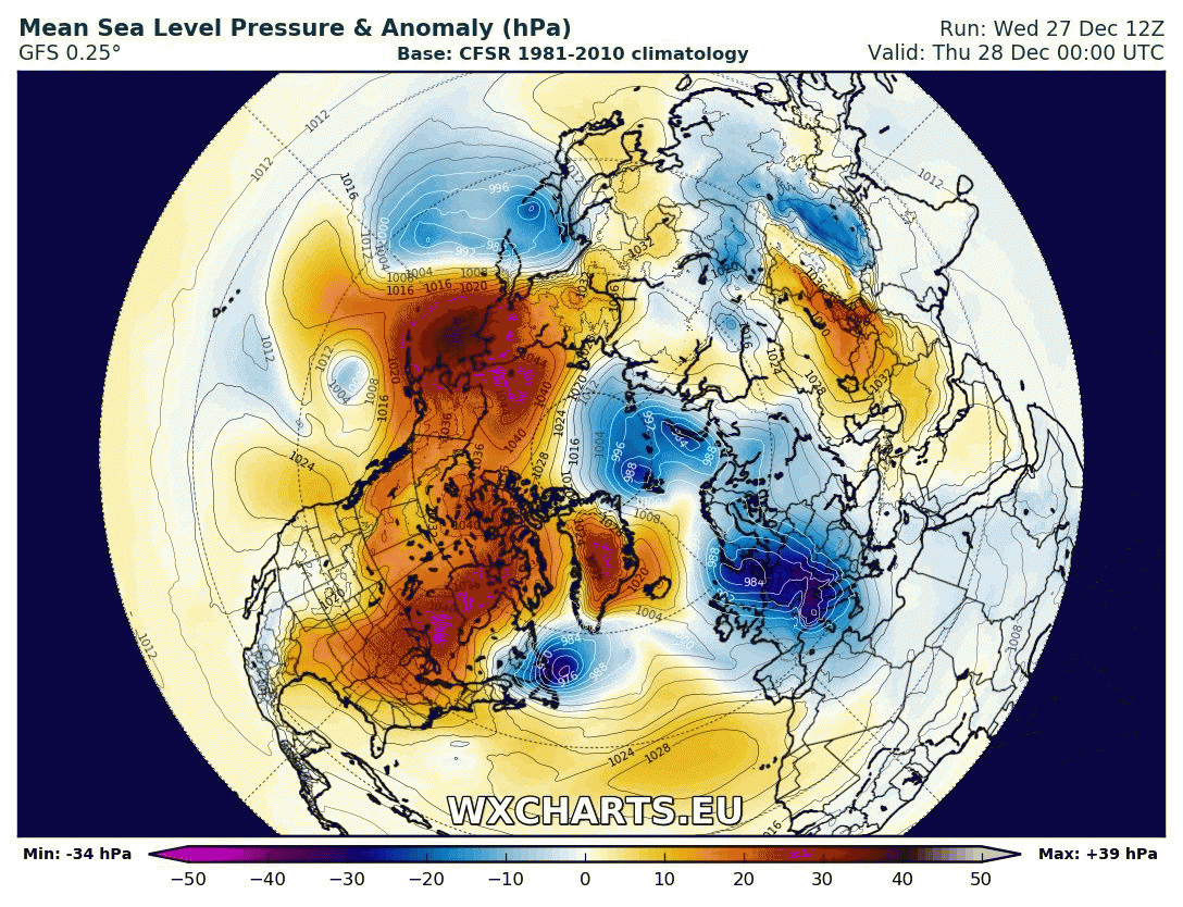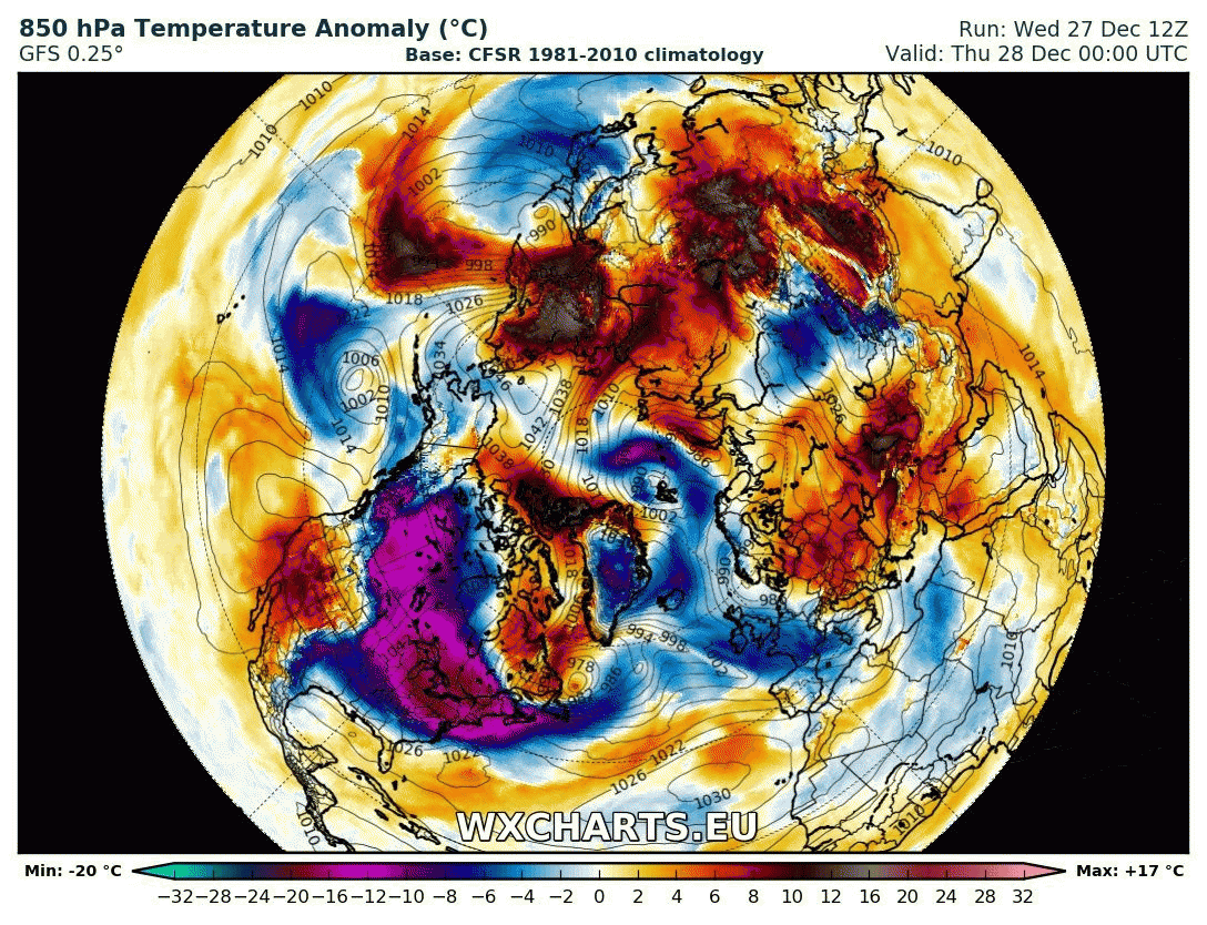 Po pokazenej predpovedi na Vianoce by nič nepotešilo viac ako veľkolepý návrat zimy. Celkovo síce zimné vyhliadky vychádzajú a od prestavby cirkulácie smerom k priaznivým zimným parametrom nám síce vyšlo niekoľko novembrových a predvianočná decembrová vlna chladu, na konci novembra, ale aj pred Vianocami sa však objavili aj nečakané oteplenia, ktoré s pretrvávajúceho teplotne podpriemerného počasia s priaznivými podmienkami pre výskyt sneženia či silných mrazov na krátky čas pokazili dojem z teplotne a zrážkovo vydarenej zimy 2017/18. Čas ale plynie a zdá sa, že zimy 2017/18, tak ako predpokladá naša klimatologická vyhliadka /http://meteoinfo.sk/clanok/52276-klimatologicka-predpoved-na-zimu-2017-18-napriek-klimatickej-zmene-cakame-vydarenu-zimu/, si chce napraviť renomé a nielen to - dlhodobé a celoplanetárne zmeny na najbližšie 2 týždne dokonca naznačujú, že podobne ako minulý rok sa môže začať schyľovať k extrémne silným, podľa GFS z 27.12. až 30-stupňovým mrazom. Zatiaľ nám nezostáva nič iné, len extrémne studenej vzduchovej mase, ktorá aktuálne podobne ako minulý rok putuje z Kanady a USA nad Grónsko, priať len to najlepšie, aby sa nakoniec už po Troch kráľoch vyliala až nad Slovensko. Treba dlhšie sledovať naše predpovede, či sa dlhodobý výhľad bude potvrdzovať - zatiaľ sa tento trend objavuje len 3 dni.