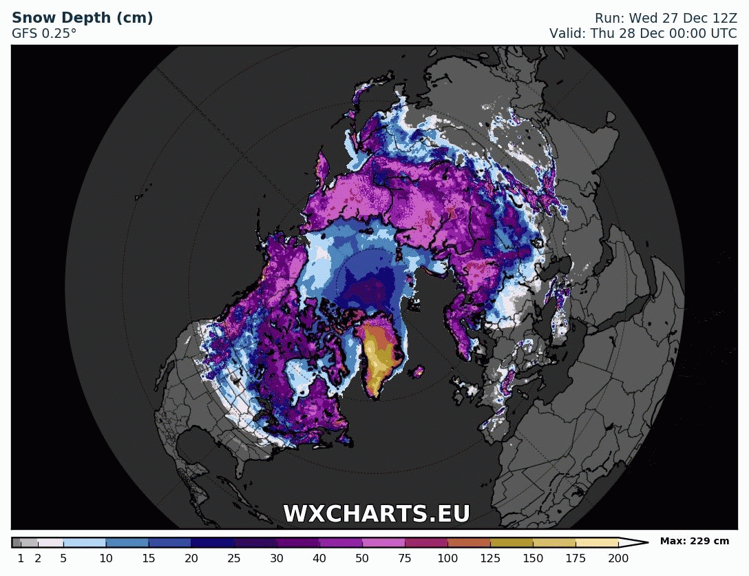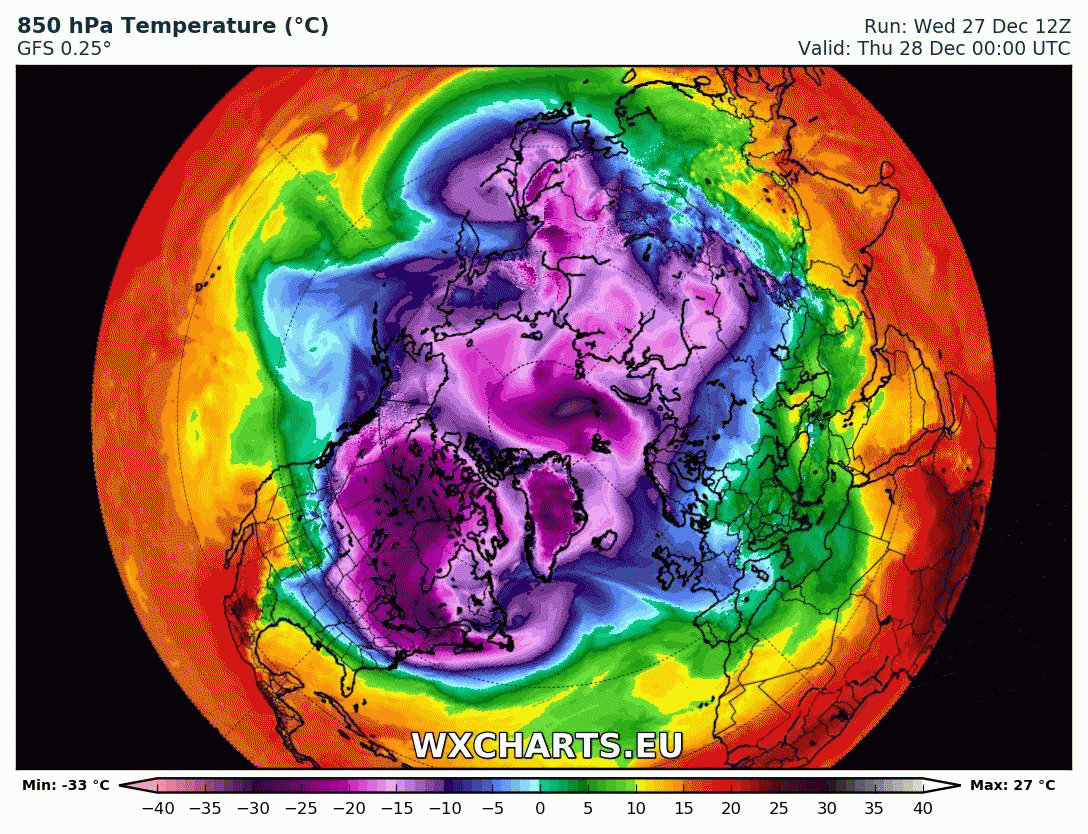 Časť vortexu sa bude postupne približovať zo severozápadnej nad centrálnu Európu a zdá sa, že medzi 4. a 10. januárom nás čaká dostatok situácií so snežením - aj intenzívnym, pričom kalamitného pol metra snehu by malo hroziť najmä v Žilinskom kraji a priľahlých regiónoch. Snehová pokrývka by sa podľa posledných výstupov GFS mala v tomto období vytvoriť na celom území - a to pomerne hrubá, okolo 10 cm, aj na juhozápade. Obrovské zásoby studeného vzduchu z Kanady a USA, ktoré sa už pred 10. januárom budú akumulovať nad Grónskom nebudú obmedzené len na samotné Grónsko, ale vzduchová hmota pohltí aj severný Atlantik a priľahlé časti Arktídy. Ako vortex postupne prejde strednou Európou na východ, môžu sa dostaviť naozaj silné mrazy - GFS po 10. januári očakáva až do-30°C a arktické dni, s maximálnou teplotou na severe počas vrcholenia možno len -15°C, na juhu do -5°C. Extrémne silné mrazy by tak mohli napraviť pokrívený dojem z tohtoročnej zimy a uistiť nás, že zima 2017/18 bude ako celok naozaj veľmi vydarená.
