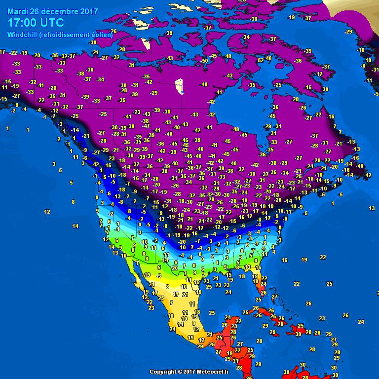 Obr.: Aktuálne pocitové teploty v Kanade a USA - studený vzduch sa postupne presunie nad Grónsko, severný Atlantik a neskôr až nad Európu - podobne ako minulý rok