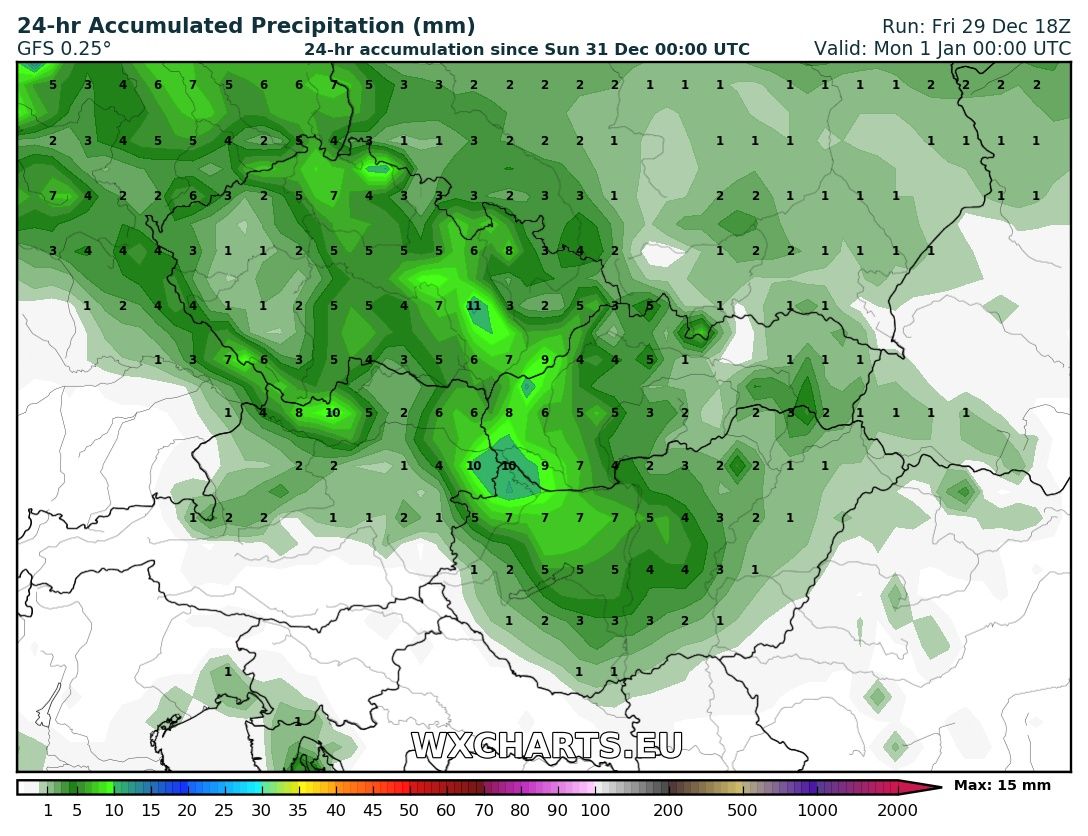 Obr.: Očakávané 24-hodinové úhrny zrážok na Silvestra 2017 /http://wxcharts.eu/